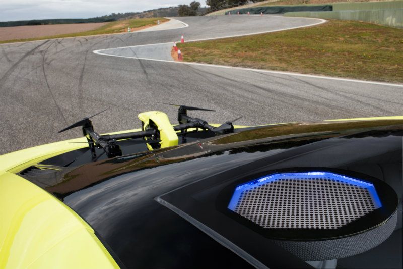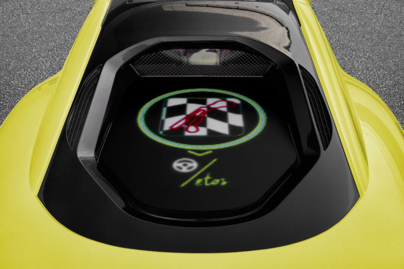 車尾上方的停機平台不只提供無人機的停放功能,其實本身是由12,000顆LED所構的一塊超大顯示螢幕,因此可投射出任何想傳達的訊息或圖案,而且具備無線攝影機的無人飛行器可在任何時間任何地點提供駕駛查看車輛周遭的即時影像,甚至透過網路將影像傳送給朋友觀看。