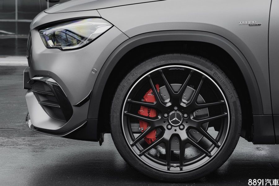 原廠為GLA 45標配19吋十輻式輕量化AMG鋁圈,S版則換上20吋五輻款式,但也提供21吋式樣供兩款小休旅選購。剎車系統部分,GLA 45前輪標配350mm打孔通風碟與四活塞卡鉗,動力較大的S版則換上360mm碟盤搭配六活塞紅色卡鉗,不過一般版也可透過選配升級。後輪則統一為單活塞卡鉗+330mm碟盤。