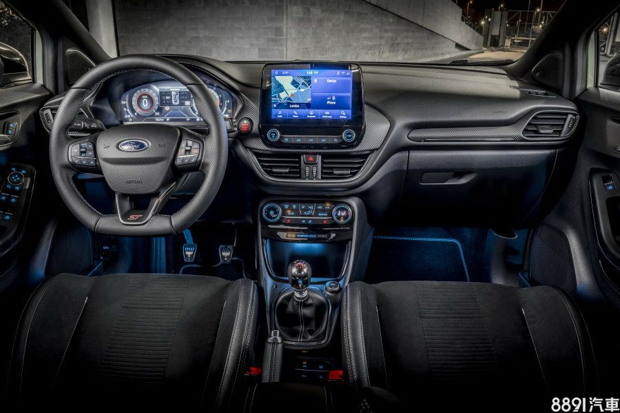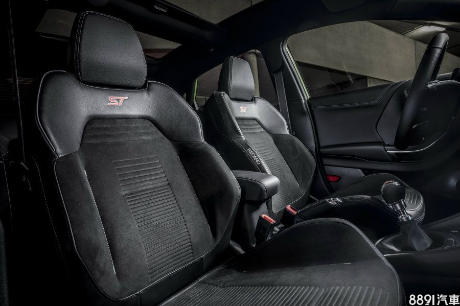 車室透過金屬灰色車縫線、類碳纖維飾板等強化動感氛圍,配置ST專屬方向盤、擁有ST字樣的Recaro運動化座椅,儀錶與多媒體系統在開機時也擁有專屬顯示樣式。