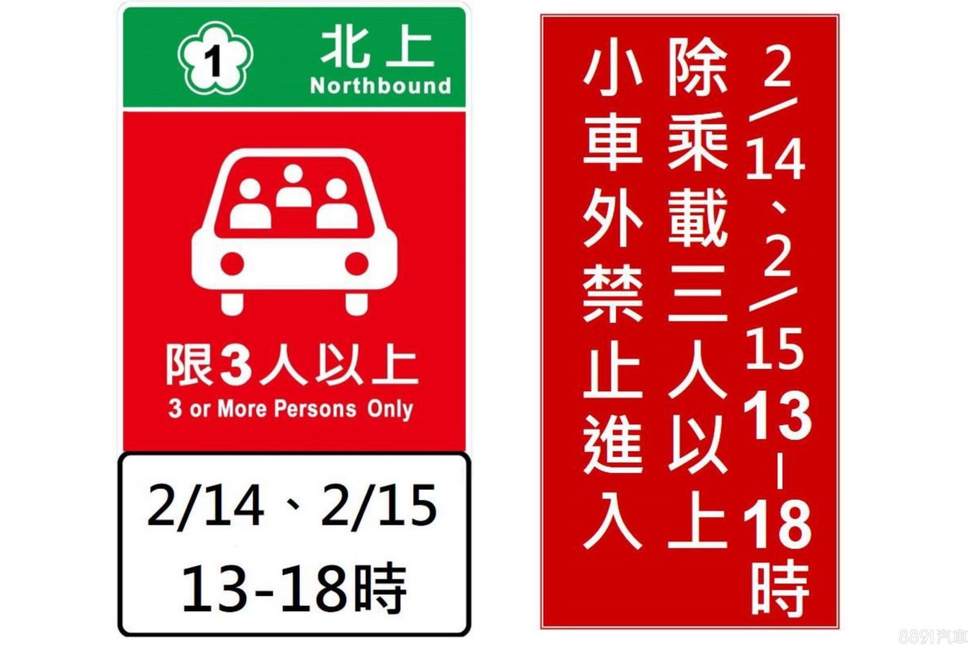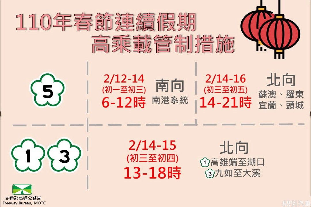 今年春節連假會於國1、國3及國5部分路段及時段實施高乘載管制,在實施管制的交流道入口前,會設置圖形化告示牌;並於交流道入口處,設置文字型之紅底白字禁制性告示牌,明確告知用路人高乘載管制之日期及時段。