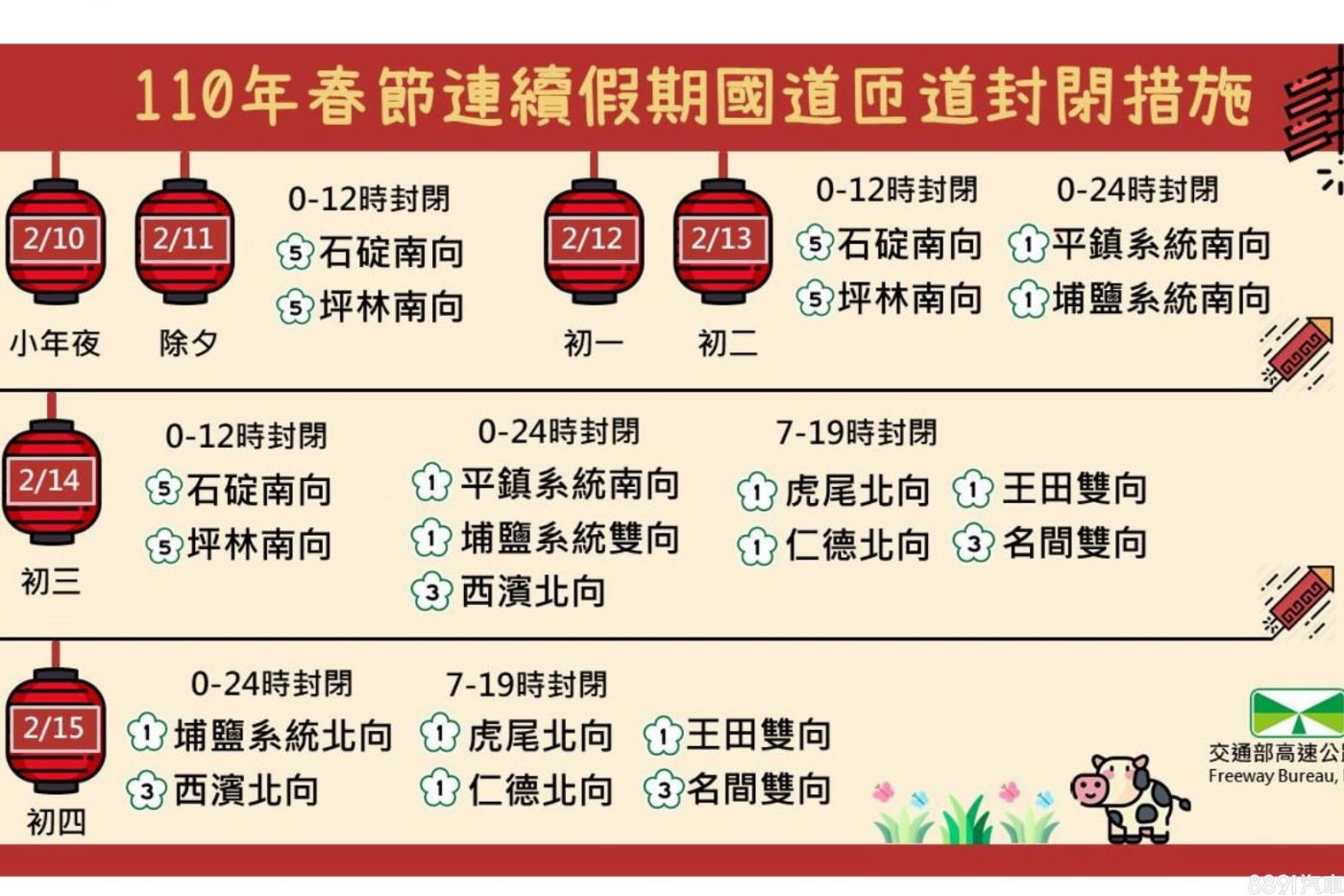 今年春節連假實施匝道封閉之路段及時段: