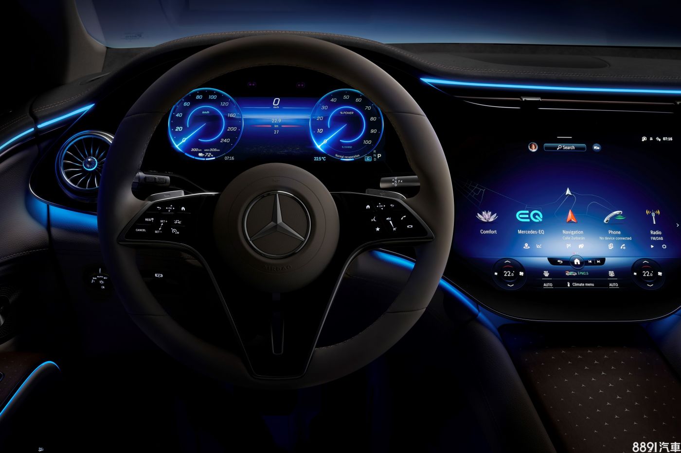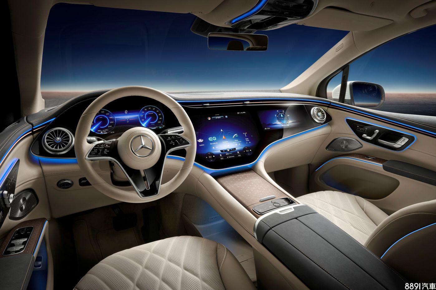 內裝完全移植EQS的曲面OLED螢幕設計,由12.3吋數位儀錶與12.8吋多媒體螢幕組成,標配的新一代MBUX,強化「Hey賓士」語音助理的對話與學習能力,能夠執行更多功能,也能夠辨別指令是由駕駛或乘客發出。