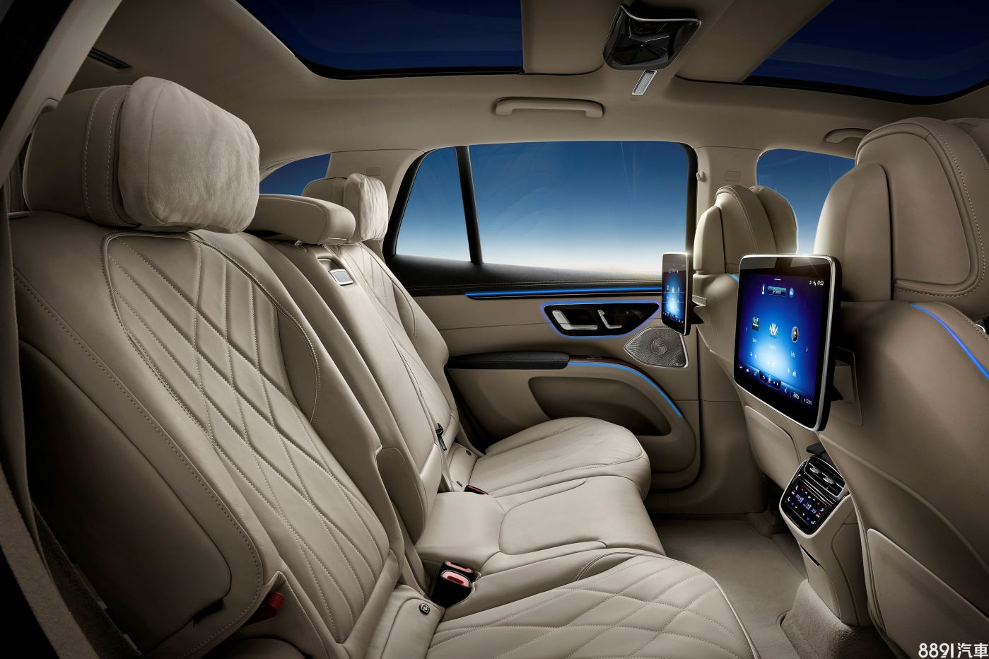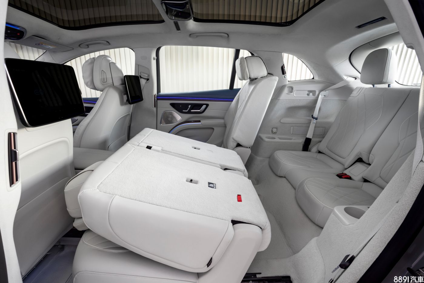 第二排座椅標配電動滑軌,可前後滑移最多130mm,同時椅背也具備調節功能,分別可向前傾14度、向後倒4度,方便乘客調整至最舒適的坐姿,另外,兩側乘客座也提供豪華型頭枕以及兩具11.6吋螢幕的選配。若車主有多人乘載需求,EQS SUV也提供第三排座椅的選擇,此時第二排座椅兩側也會新增「Easy Entry」的快倒功能,方便乘客進入。