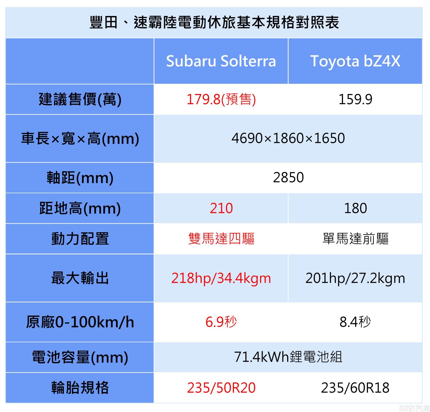 豐田bZ4X率先在5/17上市,速霸陸Solterra也緊接在2天後展開預售,兩車皆規畫單一車型,但價差卻有20萬,除了品牌定位之外,也讓人好奇兩兄弟究竟各端出怎樣的配菜?