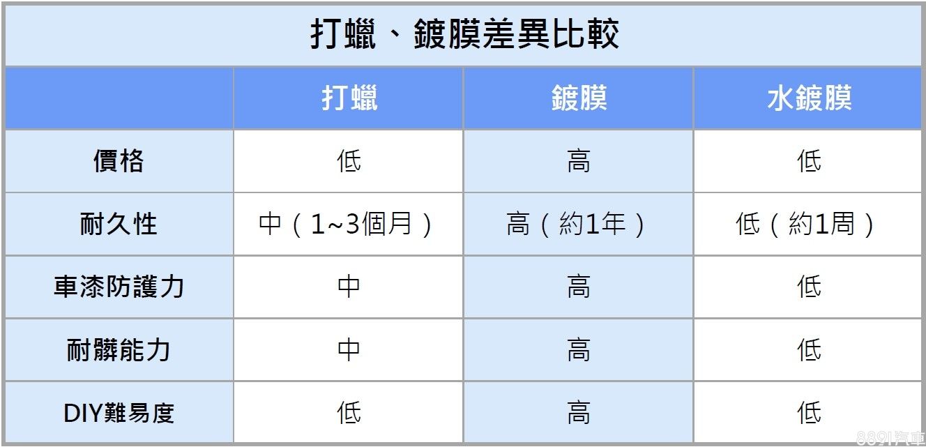 透過以下表格做個總結,打蠟因為單價較低、防護效果尚可,因此一直以來都是保護愛車的主流選擇,車主自行DIY也相當容易。鍍膜雖然價格高,但各項表現都最為出色,適合新車到手或預算較高的車主選用。至於水鍍膜產品則不建議單獨使用,搭配打蠟或鍍膜,在每次洗車後搭配使用會最為有效,也可延長蠟品與鍍膜的耐久性。