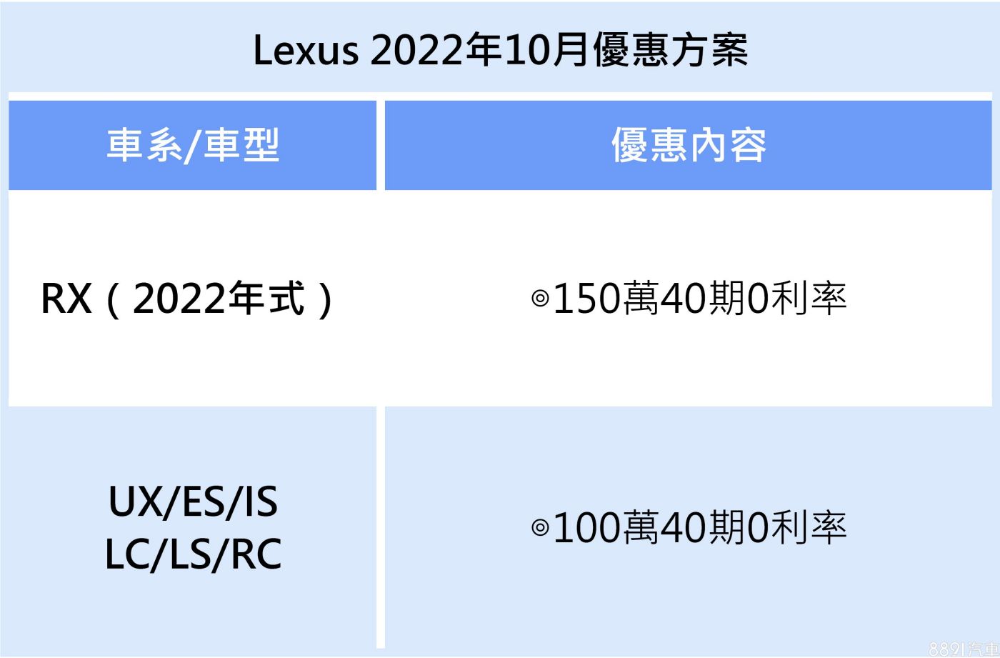 除了NX與LM車系以外,Lexus本月針對全車系持續推出優惠,提供100~150萬40期高額0利率分期專案。
