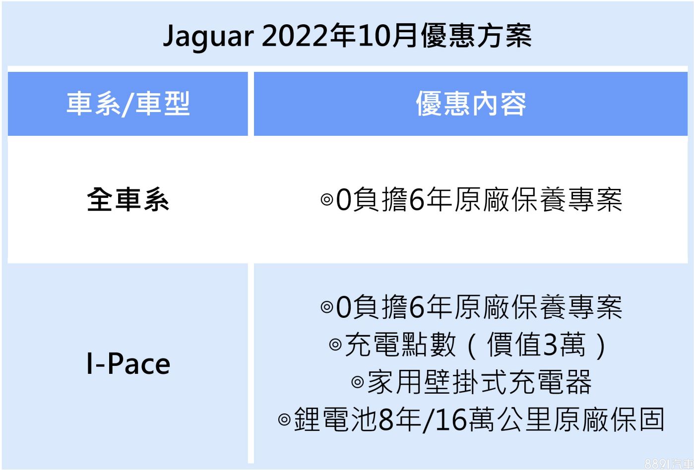 台灣捷豹路虎本月繼續針對旗下純電車款I-Pace推出購車優惠,入主即可獲得家用壁掛式充電器、充電點數與原廠電池保固,另外全車系同享0負擔6年原廠保養專案。