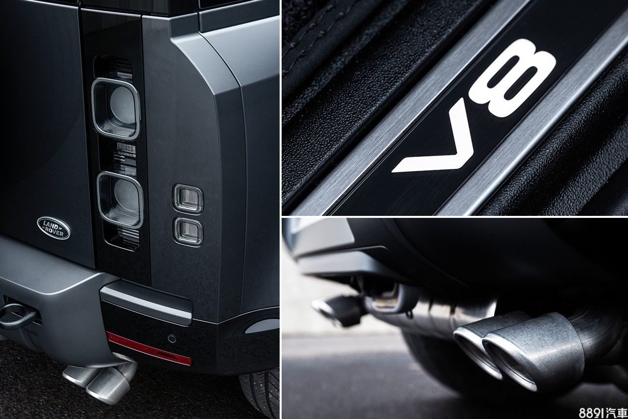 外觀維持特仕版專屬式樣,以消光灰金屬漆作為主調,並針對引擎蓋、車頂及尾門施以亮光黑烤漆呈現對比,另外22吋亮黑鋁圈、車門V8金屬踏版,與極具性能氛圍的雙邊四出尾管設定,都是V8特仕版強烈的身分表彰。