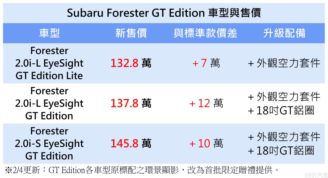 小改款Forester在台灣開賣至今也過了一陣子,Subaru打算藉由一些造型更新來增添新意,並於今(2)日宣布為車系追加「GT Edition」特仕版,不論是入門的2.0i-L或頂規2.0i-S車型,皆可以套裝選配方式加價升級。