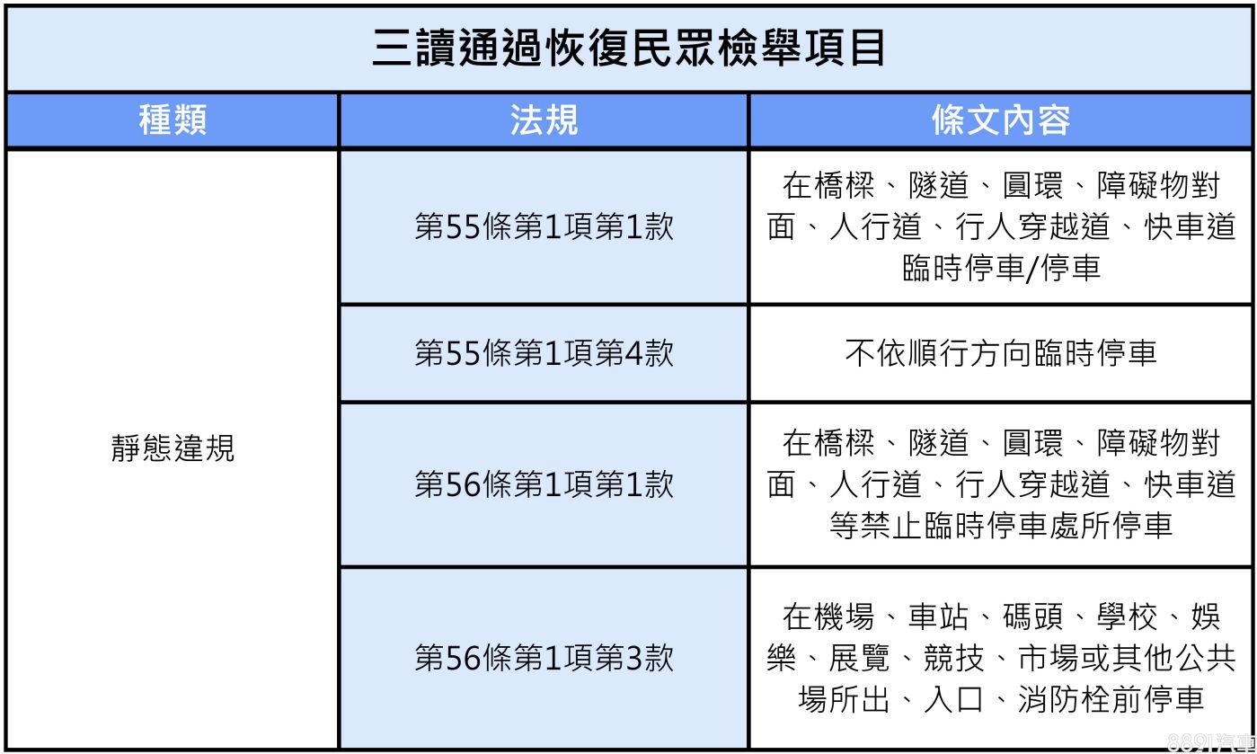 雖說立法院目前已三讀通過此項道交條例修正案,恢復部分民眾可檢舉項目已成定局,但並不代表新法將即刻施行,後續交通部仍需報請行政院核定施行日期,預計得到今年第三季才會正式上路。