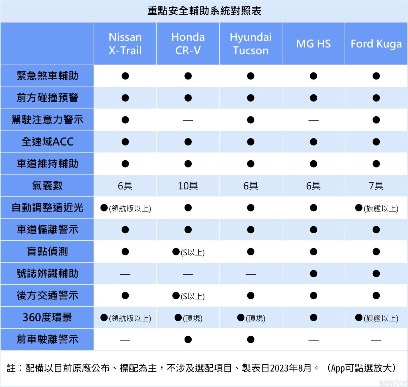 安全輔助都給得到位,五款車系均符合Level 2駕駛輔助等級。CR-V的10顆安全氣囊是五車之最,但也是入門款沒盲點偵測和RCTA後方交通警示的唯一車系。相形之下,X-Trail表現中規中矩,雖然特色亮點不多,但基本安全配備也沒少給。