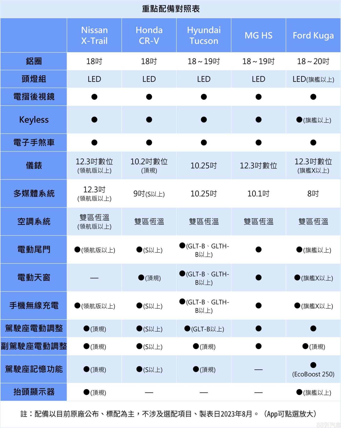 參與對比的五款SUV配備不差,大多在中階以上已足稱豐富,即便規格不一,但均有數位儀錶和觸控多媒體系統,手機無線充電座、雙區恆溫空調和電動尾門也沒少,至於電動雙前座則多配置於高階車型,但正因為各車廠策略相仿,各款SUV都無法給出明顯勝過對手的配備優勢。