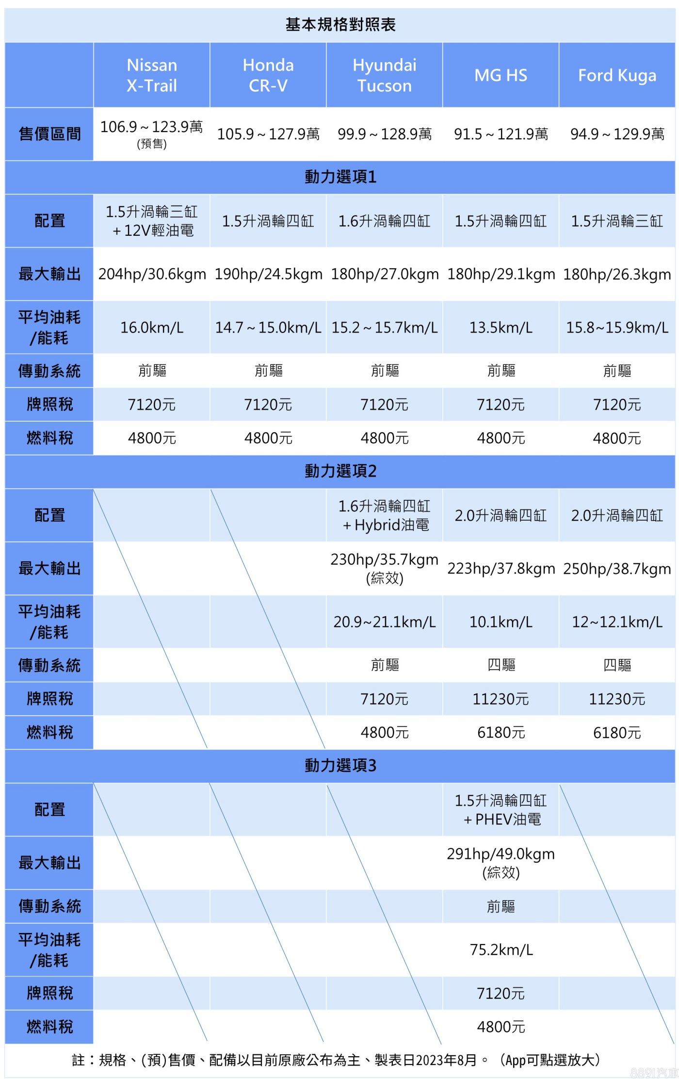 五車系中,僅HS和Kuga另有供應2.0升四驅版本;若是講究能耗經濟性的消費者,則可考慮Tucson Hybrid或HS PHEV等油電車款,兩車在節能性上都有明顯優於同級純燃油動力車型的表現。