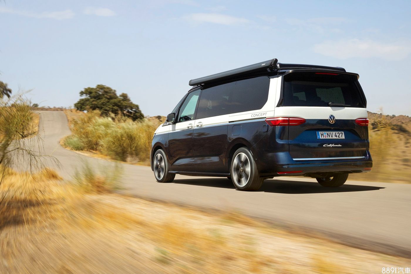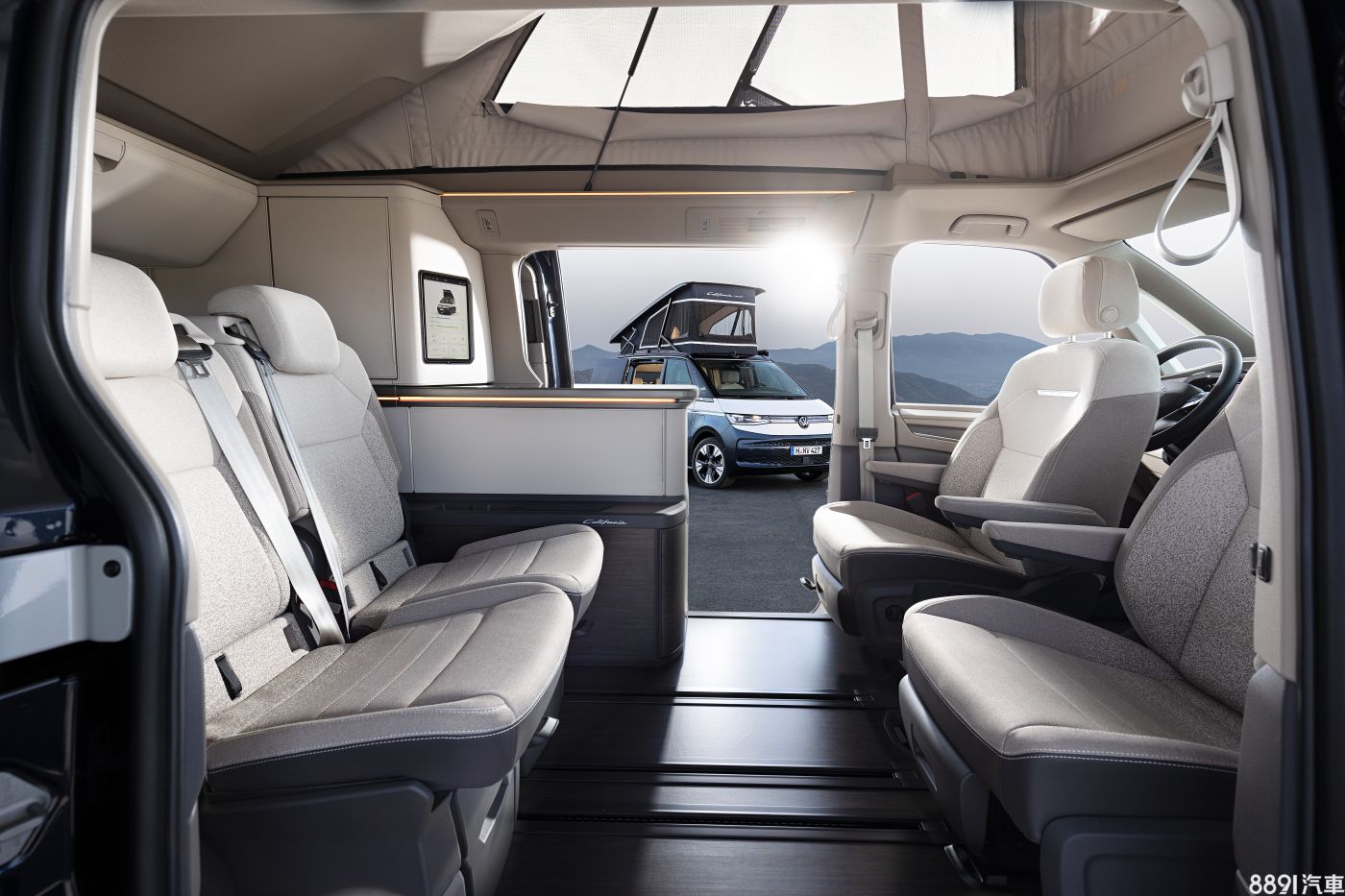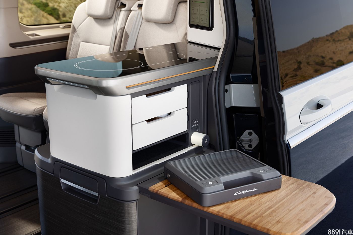 以往California車型於駕駛座後方設置折疊式流理台,但也該側也因而無法設置滑門,後排乘客只能藉副駕駛座側進出。不過在新California概念車上,由於改採短而寬的固定式流理台,讓兩側都能設置側滑門,也進而允許在車外直接使用流理台設備。