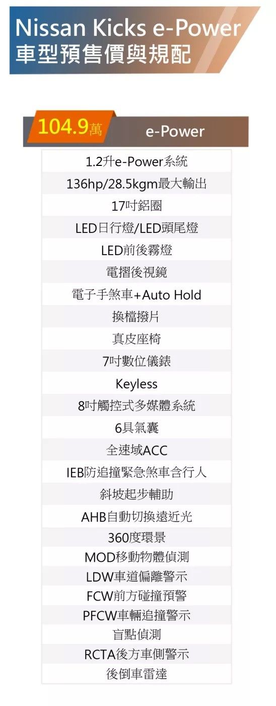 自年初以來已數度預告的Nissan Kicks e-Power,終於在日前展開預售接單,採泰國製造進口販售,國內供應單一車型,預售價104.9萬,新車詳細配備規格也於稍早公布,正式上市時程則預計落在10/19。