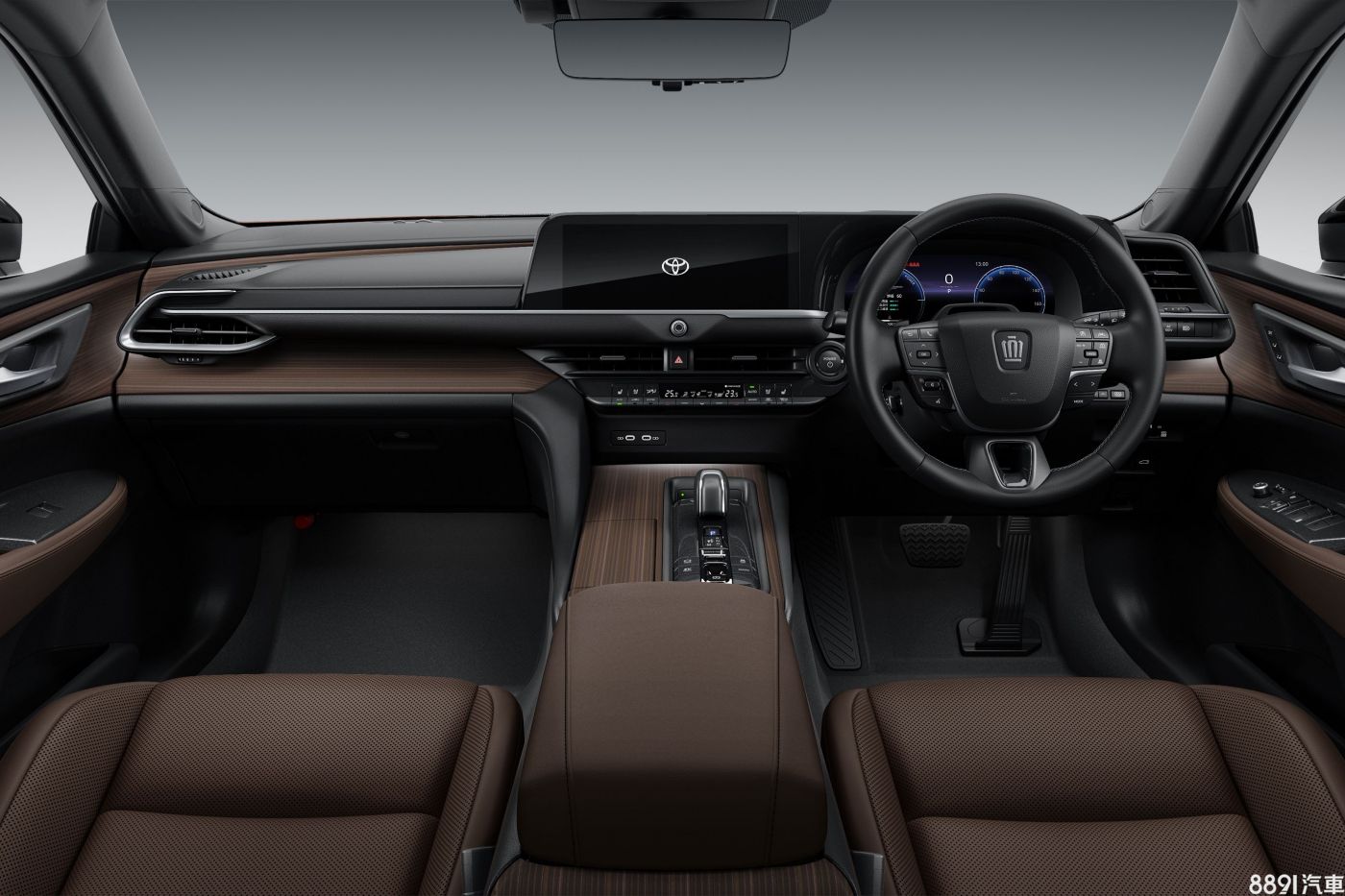 座艙部分明顯沿用新世代Crown的家族設計,以水平線條為主,配備雙12.3吋的數位儀錶及觸控多媒體系統作為主要數位介面,圖中示範款搭配木紋內裝飾板增添質感,並提供純黑或黑/棕雙色的內裝配色可選。