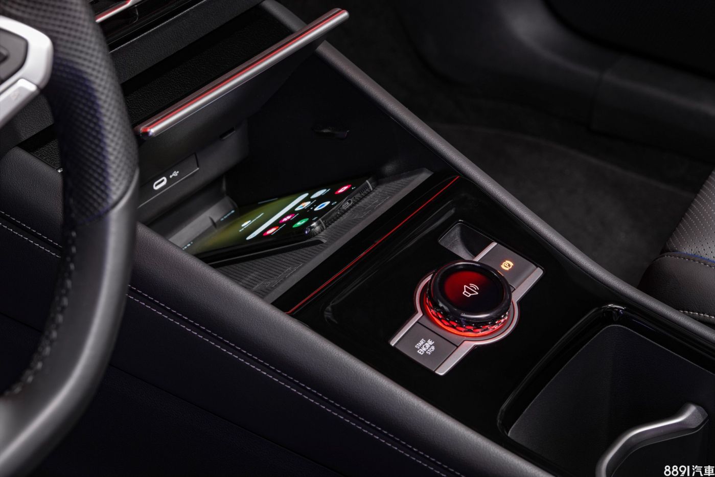 中央鞍座的旋鈕可進行包含駕駛模式、音量調整、多媒體及氣氛燈等操作,左側為引擎啟動鍵,前方則設置手機無線充電裝置。