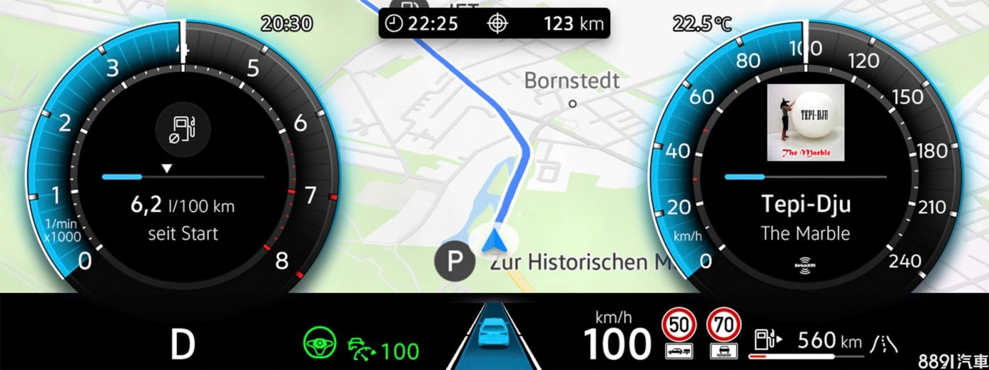 全數位儀錶資訊相當豐富,除了顯示轉速、時速、油耗等基本資訊的雙環設計,背景還能同時提供導航,下方並有主動安全、速限辨識、預估行駛里程等。