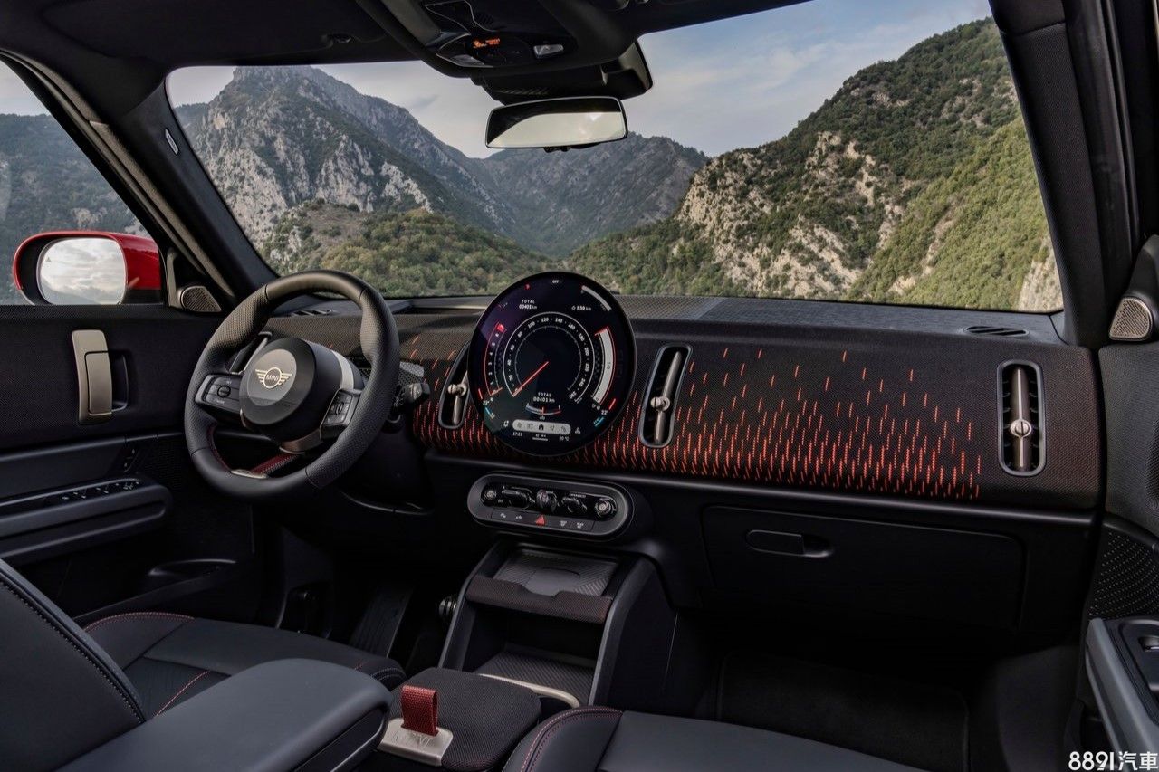 座艙維持新一代Countryman的鋪陳,以直徑24cm的圓盤狀OLED中控觸控螢幕作為主要顯示介面,而JCW則是將中控台飾板改以編織紋路,甫以大面積的紅色縫線,營造出不俗的熱血氛圍。