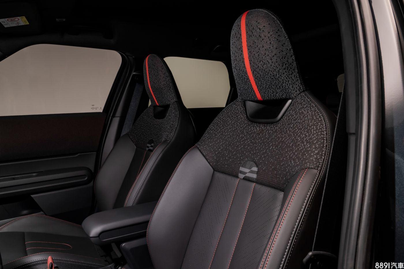 座椅也升級專屬JCW運動化款式,如圖所示,座椅採用複合材質包覆,椅背下半部及椅墊採用真皮,肩部以上則運用織布,並在頭枕處貫穿一條相當搶眼的紅色飾條。