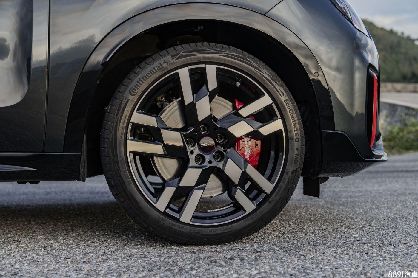 JCW Countryman標配19吋鋁圈,並提供20吋(如上圖)的選配款可作升級,造型與Logo的「方格旗」有相呼應,搭配245/40R20德國馬牌EcoContact 6Q,蠻讓人好奇這樣一款性能車,為何配備強調靜肅性的節能胎,另外原廠提到胎寬比舊款增加20mm,將有助於提升操控的穩定性。