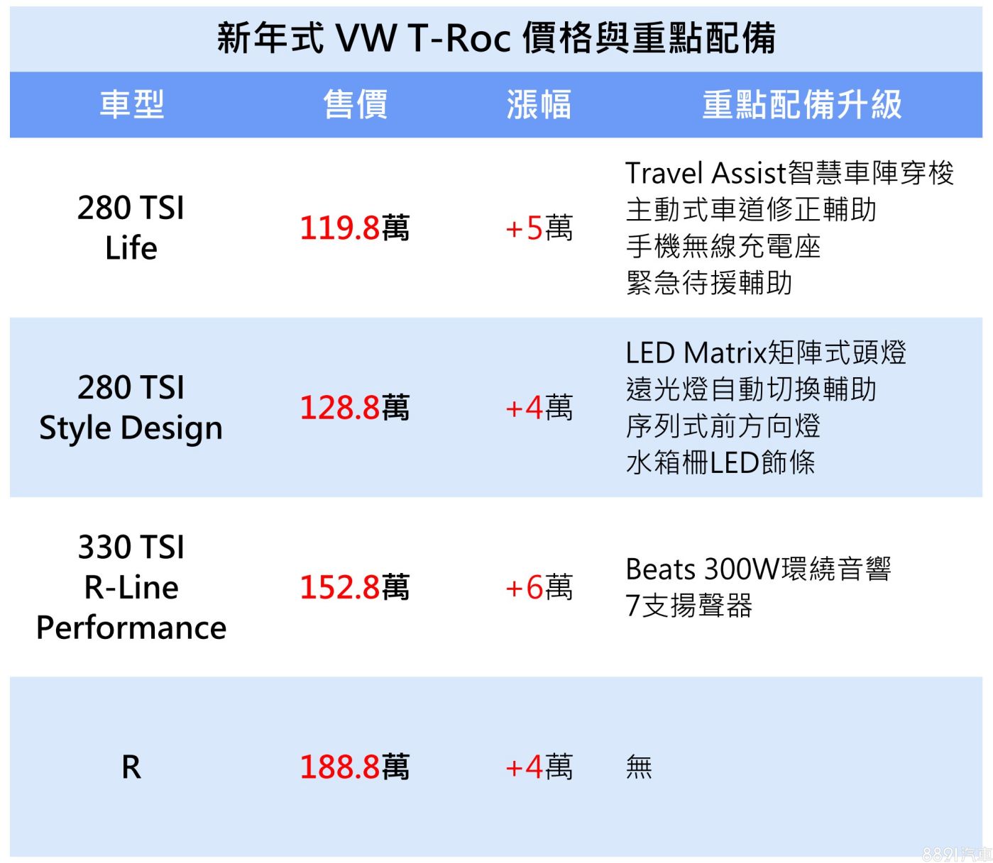 2024年式VW T-Roc正式上市,維持280 TSI Life、280 TSI Style Design、330 TSI R-Line Performance和R的四車型編成,均延續既有動力配置,但新年式各車型售價均小幅調漲,漲幅4~6萬不等。