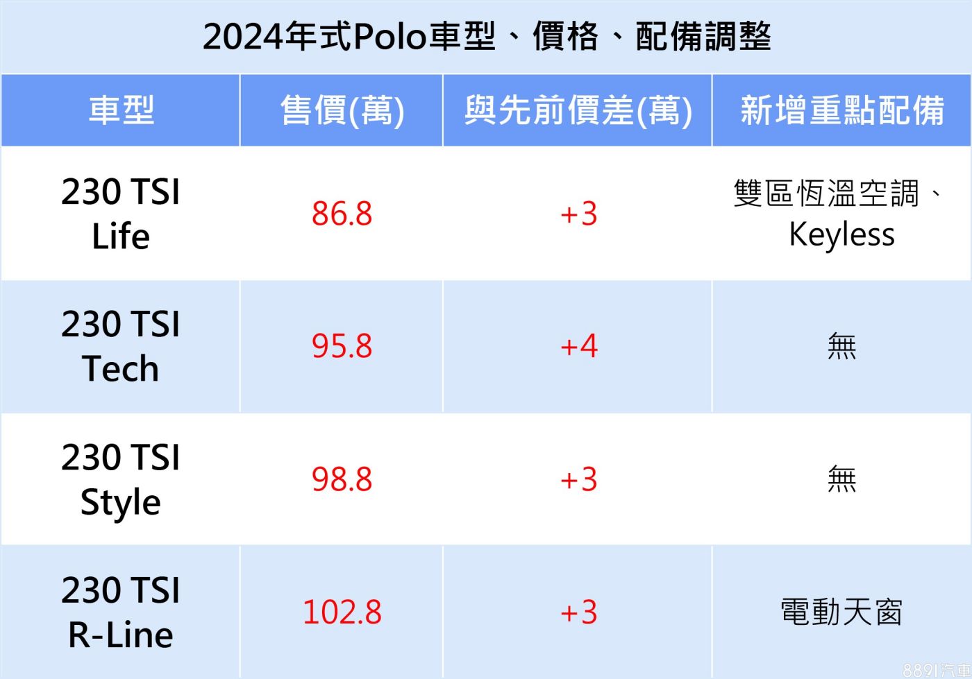 2024年式Polo維持既有編成,提供4車型:230 TSI Life、230 TSI Tech、230 TSI Style、和230 TSI R-Line,售價分別為86.8、95.8、98.8和102.8萬元,與舊年式相比,售價依車型不同有著3至4萬之漲幅,入門追加雙區恆溫空調、Keyless,頂規增配電動天窗,其餘版本在配置上則無變動。
