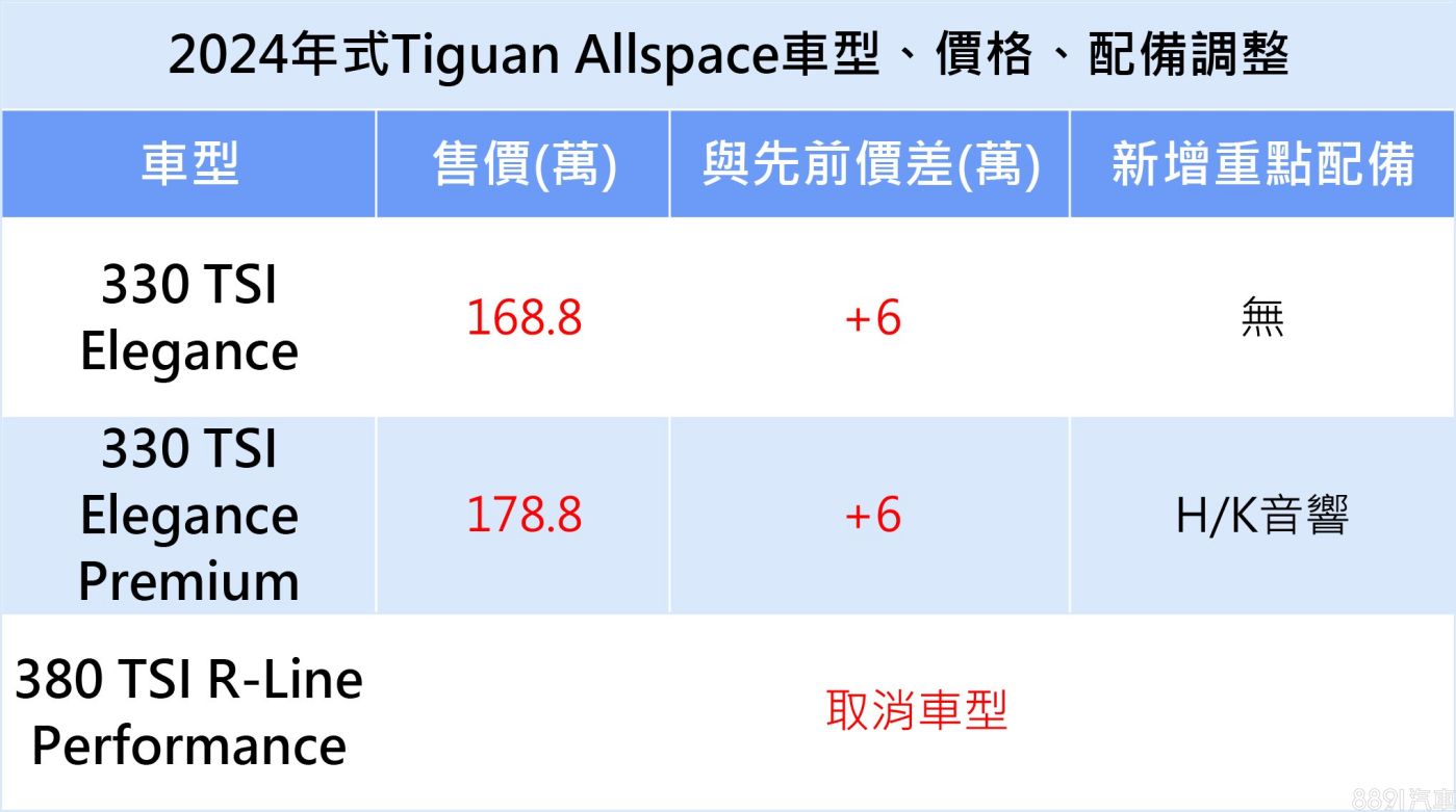 新年式Tiguan Allspace捨棄了頂規的380 TSI R-Line Performance版本,僅提供330 TSI Elegance和330 TSI Elegance Premium雙車型編成,售價均有著6萬之漲幅,各為168.8和178.8萬元,配備方面,330 TSI Elegance Premium 增配H/K音響,入門版則無變動。