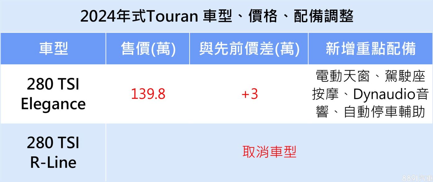 Touran新年式縮編為單一280 TSI Elegance車型,開價139.8,較過去小漲3萬,但追加了電動天窗、駕駛座按摩、Dynaudio音響、自動停車輔助等為數不少的配備。