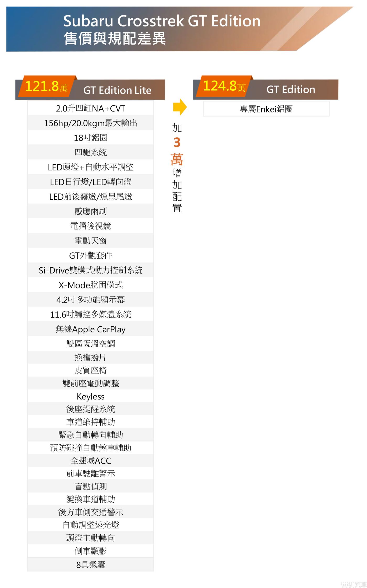 Crosstrek GT Edition提供Lite和GT Edition雙車型可選,分別開價121.8、124.8萬元,新車預計5/4正式上架,與先前的差別主要在於搭載了GT套件,均標配專屬前後下擾流、側裙、車頂擾流尾翼,GT Edition比Lite再多出造型極具張力的Enkei鋁圈。
