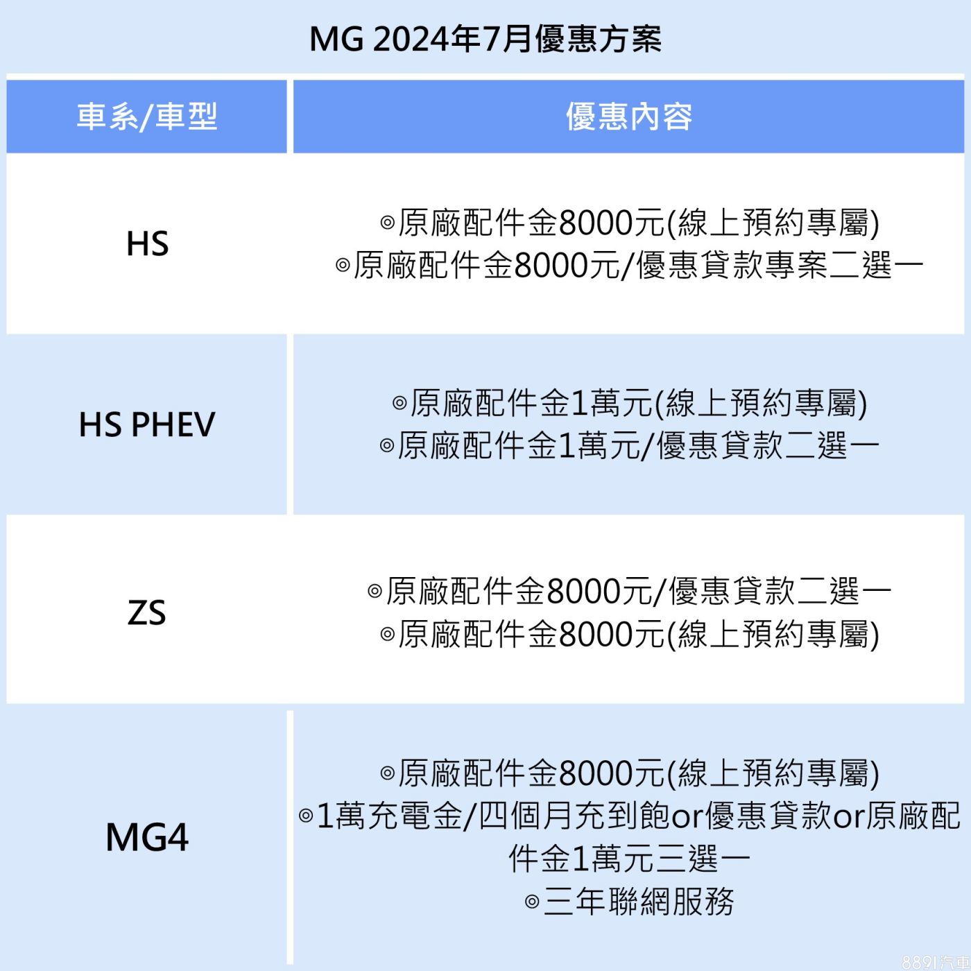 MG全車系除了既有的線上預約送最高1萬配件金,以及輕鬆入主方案,只要在7/1~7/31期間,入主並完成領牌,就送8000配件金!