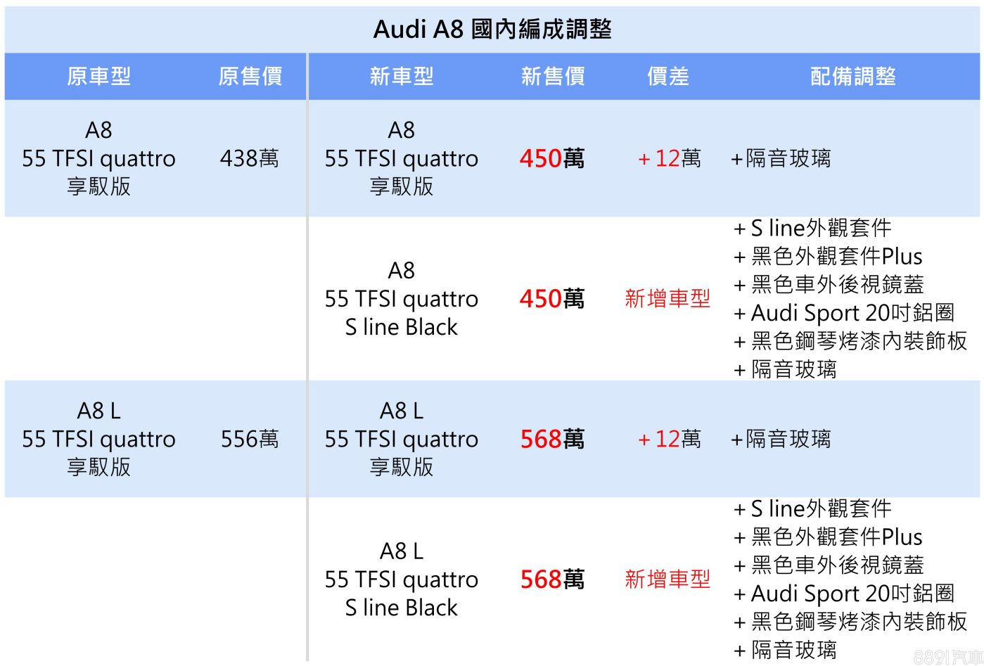 Audi旗艦房車A8宣布調整國內販售編成,從兩車型陣容double成四款。其中,原「A8享馭版」和「A8 L享馭版」長軸車型均持續供應,但分別開出450萬和568萬的新價格,均較先前漲價12萬元,配備上則新增標配隔音玻璃。