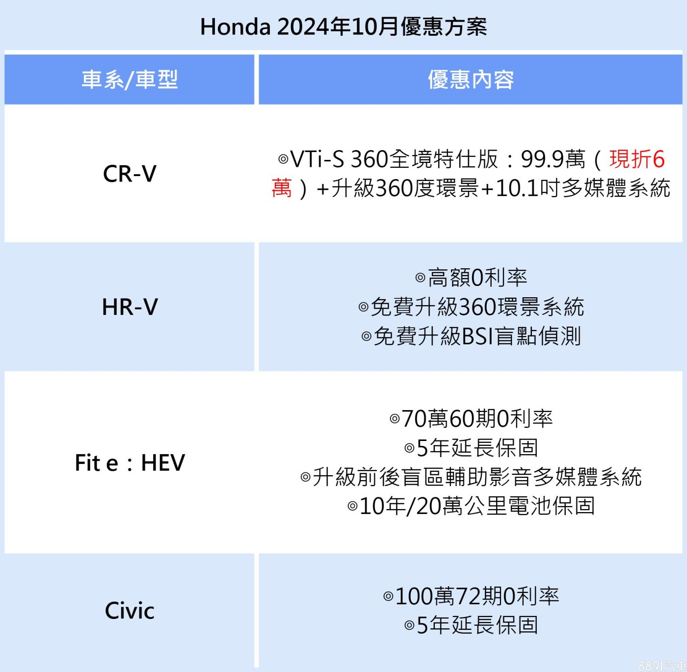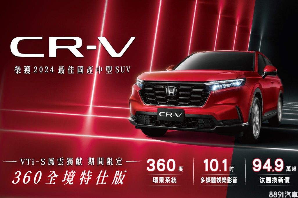 台灣本田以CR-V VTi-S車型為基礎推出「360全境特仕版」,限時優惠價99.9萬,入手現省6萬,再免費升級10.1吋多媒體娛樂影音主機、360度環景影像輔助系統。另外本月入主HR-V及Fit e:HEV尬電特仕版,除可享高額0利率外,還有搭配免費升級配備,前者獲得360度環景、BSI盲點偵測等安全輔助系統;後者則升級多媒娛樂影音主機、前後盲區顯影輔助。