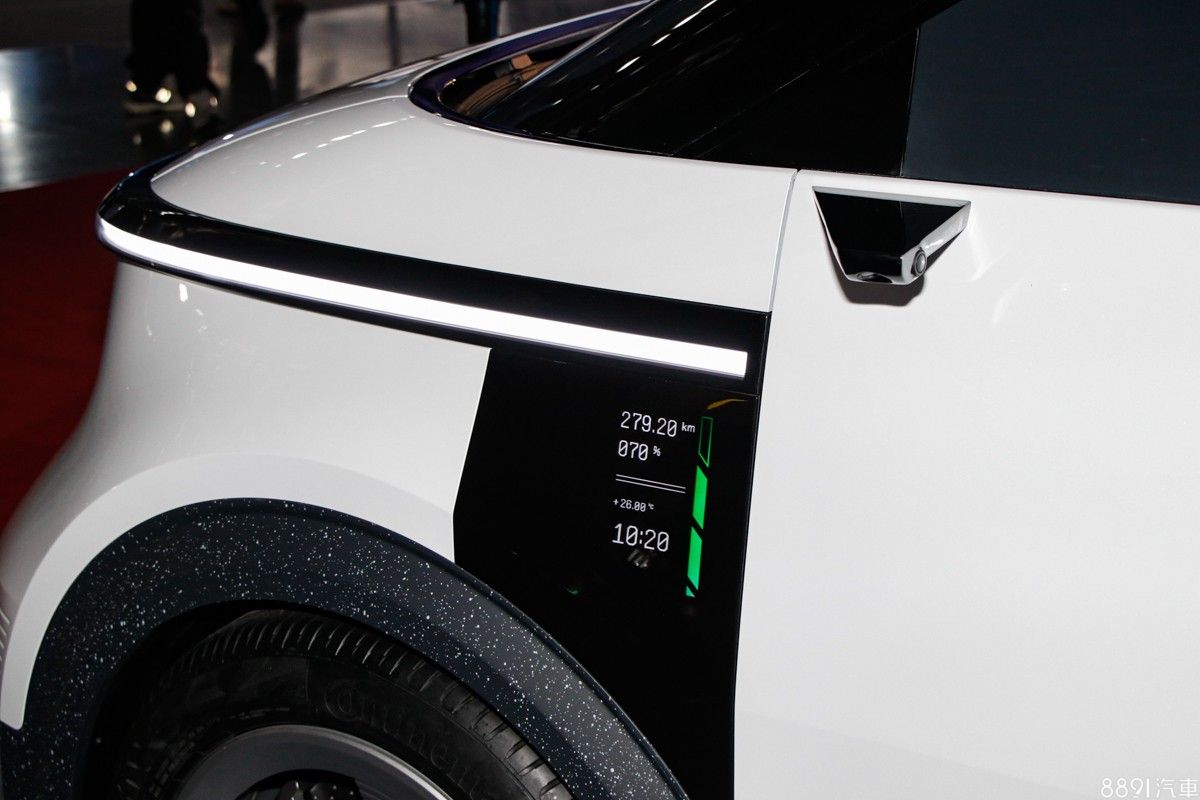 前葉子板處配置多功能資訊面板,除了電量、預估行駛里程、時間等訊息,顯示內容也能客製化,屆時預計量產版本的充電插槽也會為於此處、置於面板之下。