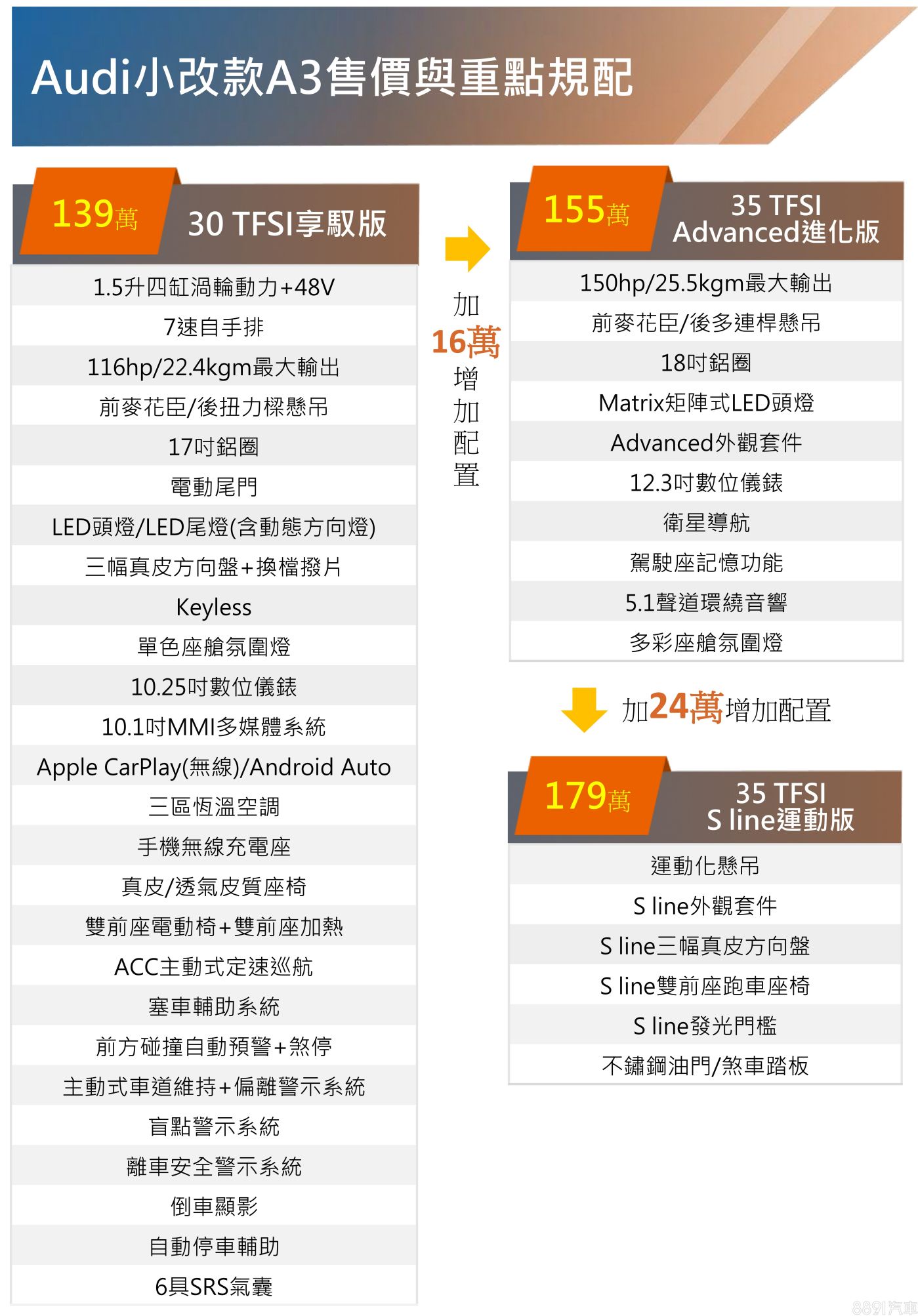 全車系搭載1.5升四缸渦輪引擎,入門30 TFSI享馭版提供116hp/22.4 kgm動力,中階35 TFSI Advanced進化版動力升級至150hp/25.5kgm,並加入Matrix矩陣式LED頭燈、12.3吋數位儀錶、原廠衛星導航、5.1聲道音響等小改款重點配備,頂規S line則加入運動化內外套件。