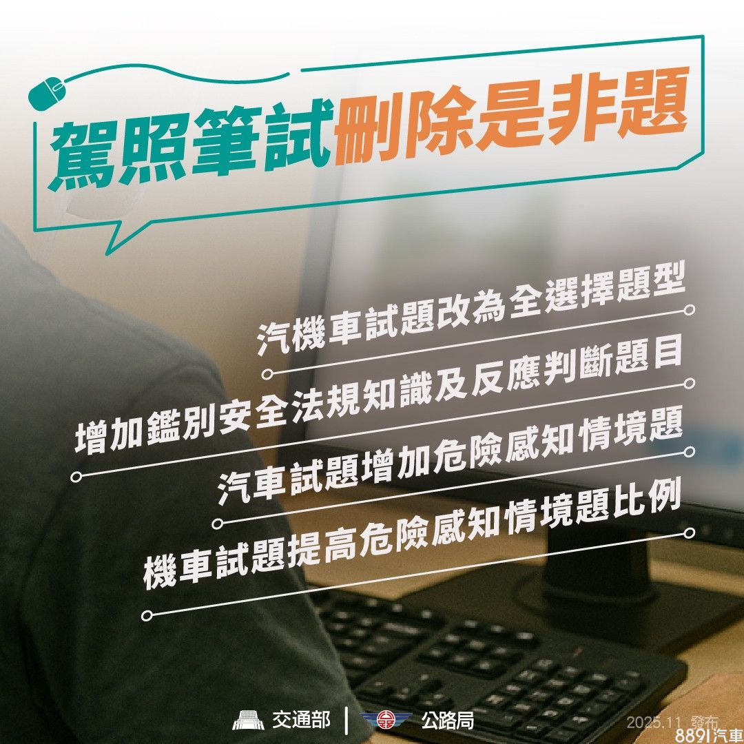 交通部表示,考照新制將著重於「提升交通法規理解」、「強化危險感知」、「降低交通死亡率」三大核心。明年起汽、機車考照筆試題目,刪除是非題,改為全選擇題,出題數仍維持50題,為強化道路安全意識,題庫將增加危險感知情境題,並刪除不合時宜的內容,現有題庫約1600題將重新檢視,預計今年12月底完成修正作業。