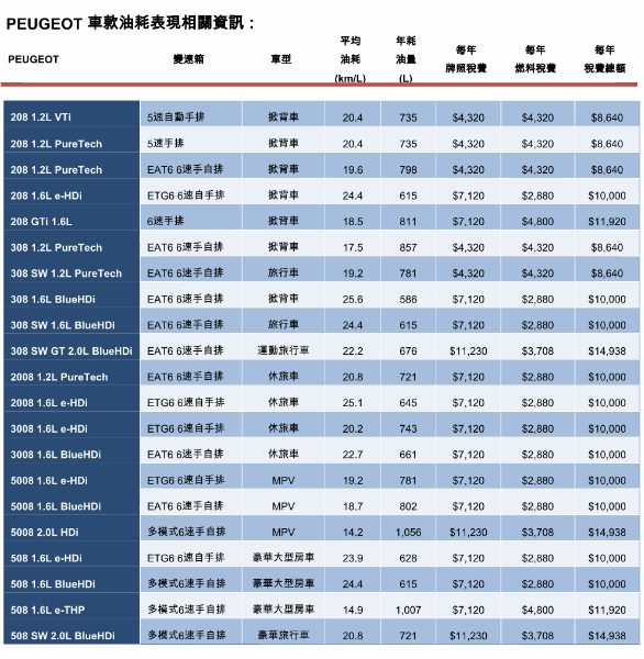 Peugeot以法式工藝體現高科技汽車動力,優異節能、低耗能及低燃料花費表現屢獲肯定,連續三年多數車款皆入圍經濟部能源局102、103、104年車輛油耗指南省油排行之列,更蟬聯內燃機車型榜首車款。欲了解相關Peugeot車款優異節能資訊,請洽Peugeot全台展示中心,或請上Peugeot官方網站、Peugeot Taiwan Facebook官方粉絲團隨時掌握最新消息。