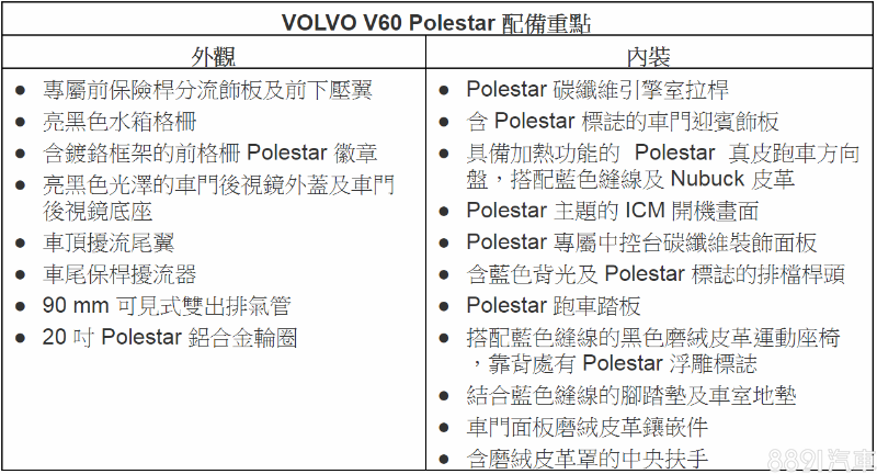 一改Volvo過去沉穩內斂、安全至上的印象,此次發表原廠性能品牌Polestar、V60 Polestar與專屬性能套件,將為Volvo帶出不同以往的跑格魅力。從9/10起,Volvo汽車全台主要8大展示中心也將輪流展出為期1個月的V60 Polestar全天候性能跑旅,敬請喜愛Polestar 的車迷朋友前往參觀;如欲了解詳細展出時間,歡迎洽詢Volvo汽車顧客服務專線0800-40-60-80。