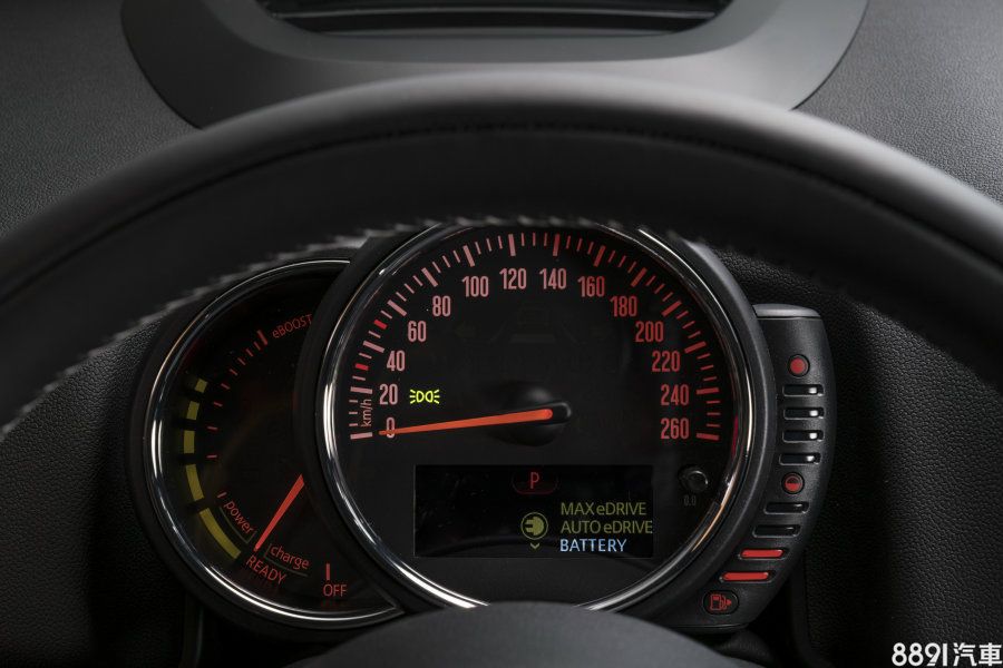 中控台LED儀表飾環可根據車輛的狀態顯示當前電量,標準配備的Mini Visual Boost 6.5吋繁體中文螢幕介面亦能隨時顯示車輛的能源分配。而儀錶板除了顯示電力與可行駛距離,左側的E-Instrument更取代一般引擎轉速錶,提供電池功率的使用狀態以及eBoost雙效動力輸出的即時信息。