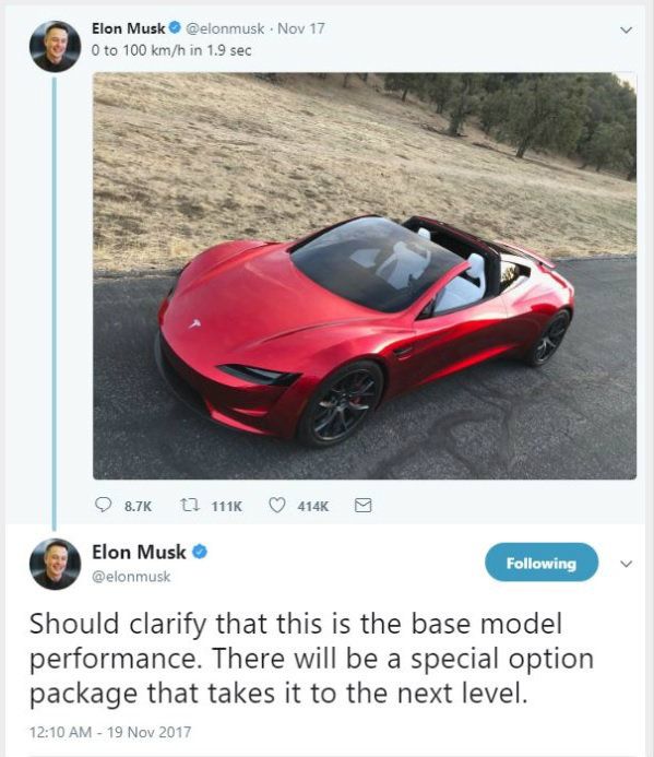 正當眾人正討論預計2020年才會正式推出的新一代Roadster,到底能否擁有如現在官網上公佈的這些猛爆性能時,Tesla執行長Elon Musk於Twitter上表示,原廠還會針對新車推出「特殊的選配套件」,而此款套件,能夠把新款Roadster帶往「另一個層級」。