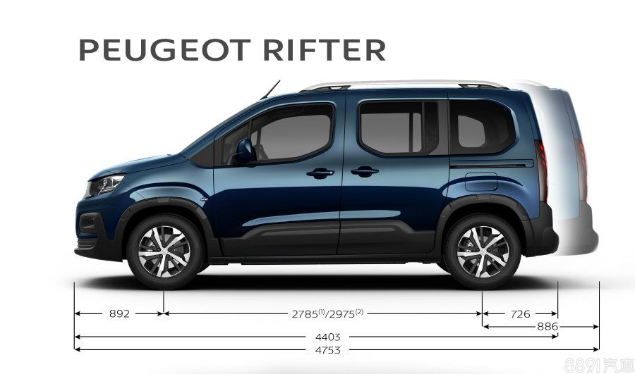 Rifter有標準版5人座、加長7人座兩種車規格,標準款車長約4.4米,與自家308相當,7人座則將軸距由2785mm拉長為2975mm,車身則增加至4753mm,而車內二、三排座椅均為每張獨立規劃,機能性與變化度是強調重點。