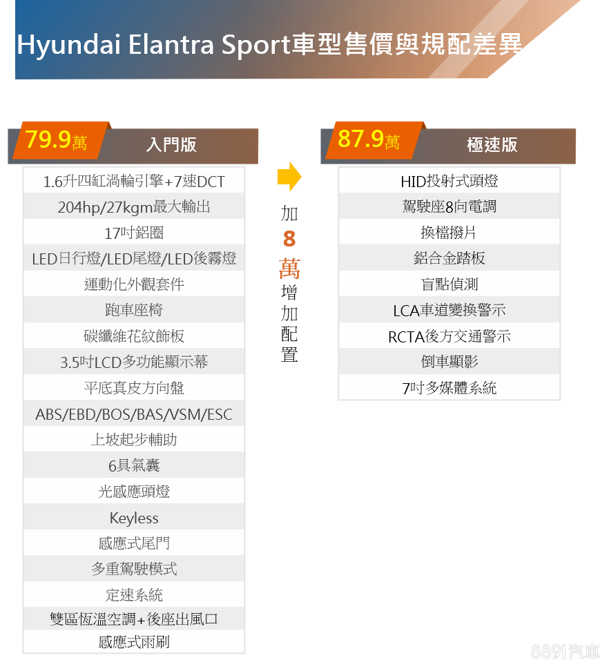 Elantra Sport此次提供入門版與極速版雙車型供消費者選擇,極速版在安全科技方面更增加BSD盲點偵測警示、LCA車道變換警示與RCTA後方交通警示系統,兩款車型價差8萬元、該如何選擇端看消費者需求。
