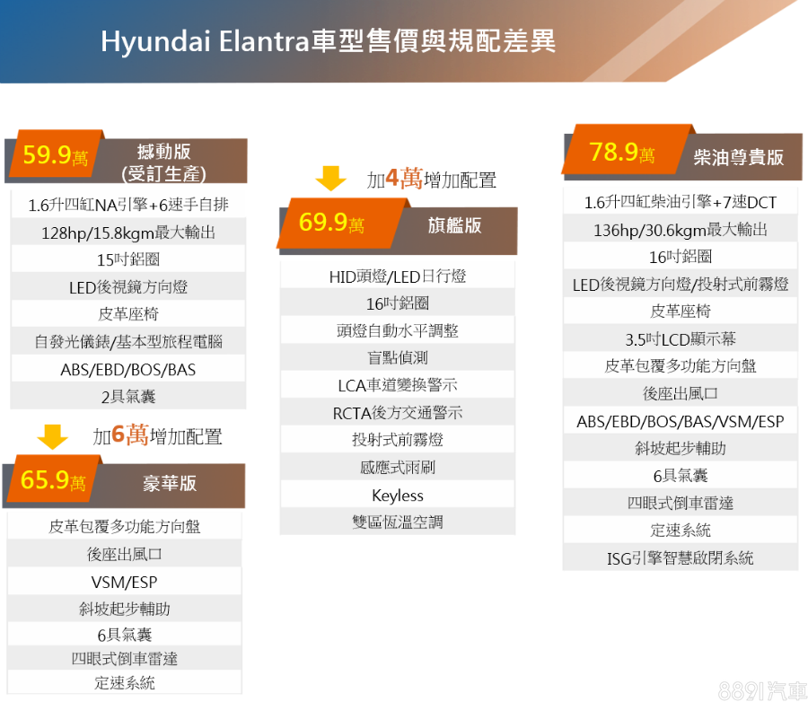 此外因應Elantra Sport國產上市,原有國產Elantra車系也跟進調整編成,取消原有2.0尊貴、旗艦與精英型,保留1.6悍動(售價59.9萬)、豪華(售價65.9萬)與1.6柴油尊貴型(售價78.9萬),另增加1.6旗艦型,售價為69.9萬。