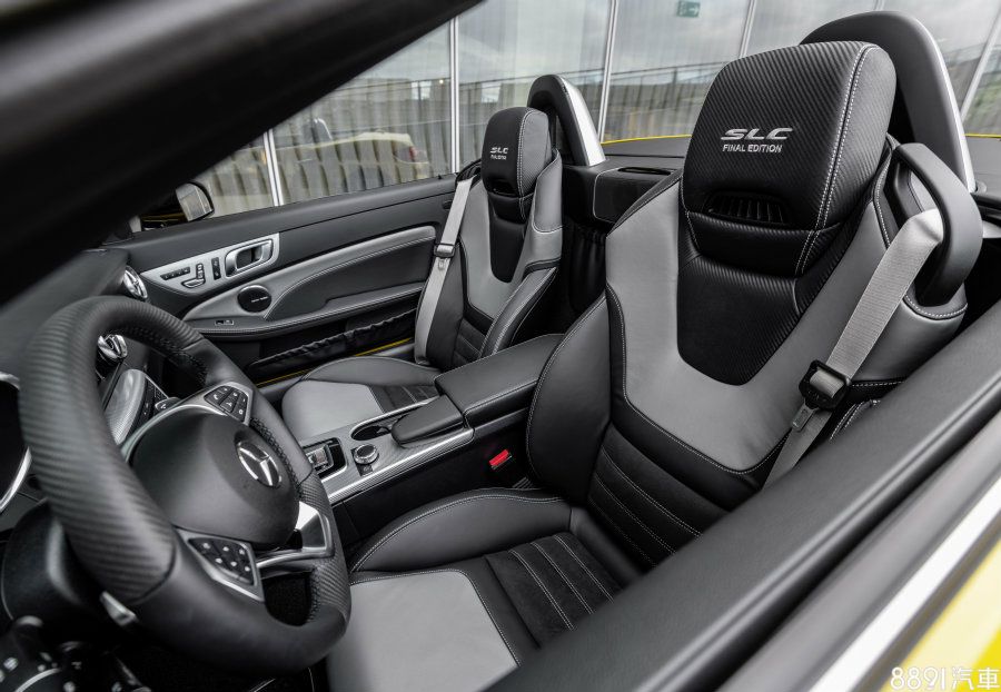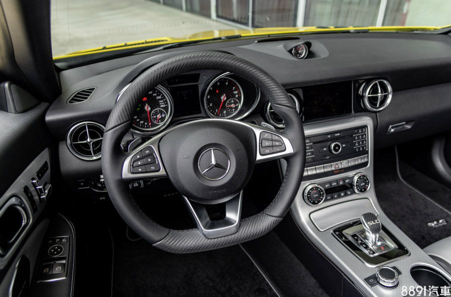 內裝與標準版車型並無明顯差異,但考量提升質感,原廠針對細節重新妝點,包含排檔座採用碳纖維紋路飾板,方向盤上下緣與儀錶邊框則分別換上碳纖維以及鋁製材質,其它諸如排檔撥片換為銀色塗裝,地墊刺有SLC專屬徽繡等特色,均可發現專屬於特別版的設計巧思。
