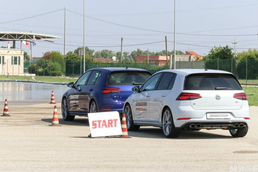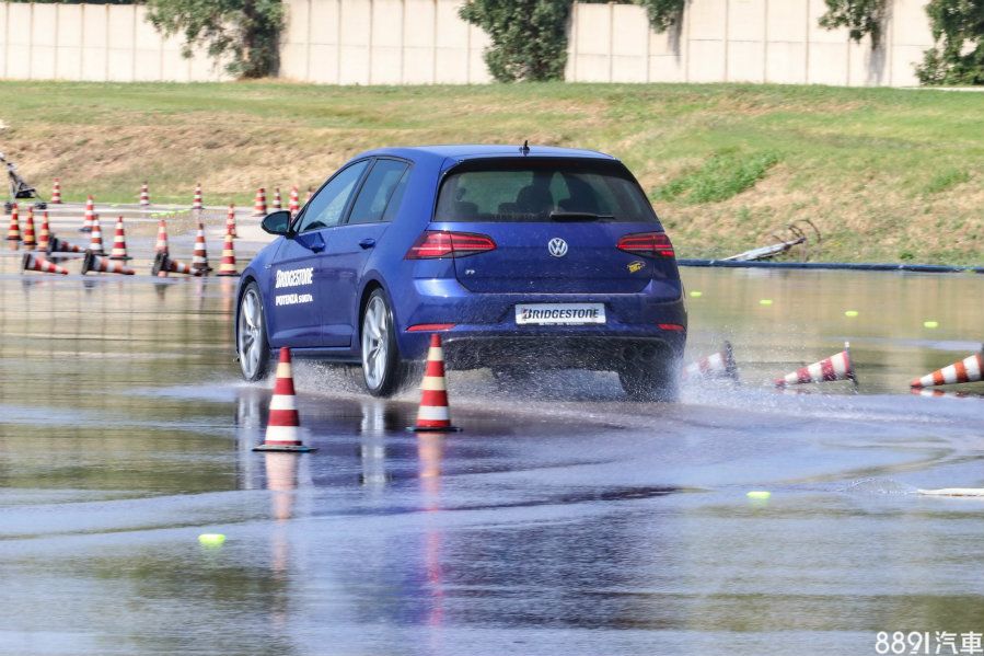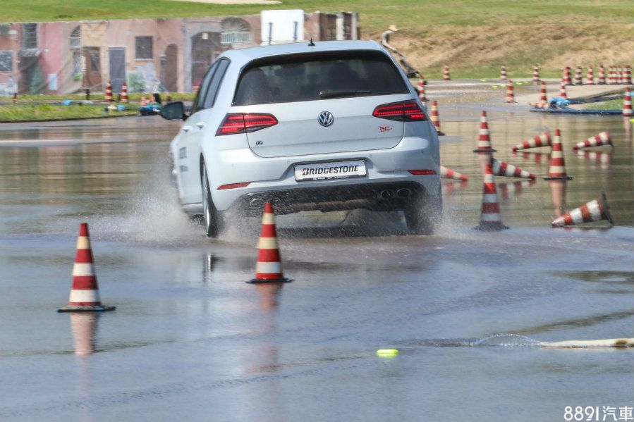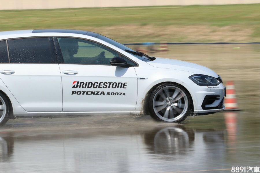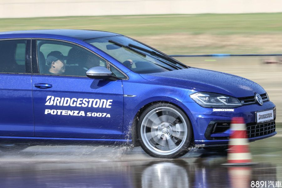 第一關的綜合濕地測試和T005是同個地方,路面隨時保持濕滑狀態,但陣仗安排稍有不同,因應輪胎屬性,加入關乎操控的繞錐體驗,並多了對照組,車款採用兩部VW Golf R,藍色車搭載Potenza S007A,白色則是前代的Potenza S001。