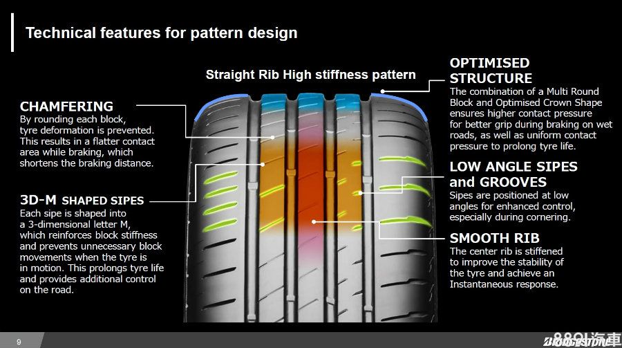 S007A的溝槽都採用3D-M型輪胎花紋,能在輪胎滾動時減少胎塊變形量,接觸地面的面積更均勻,不易發生偏磨狀況,並較前代商品增加10%壽命。