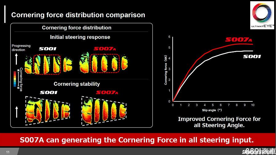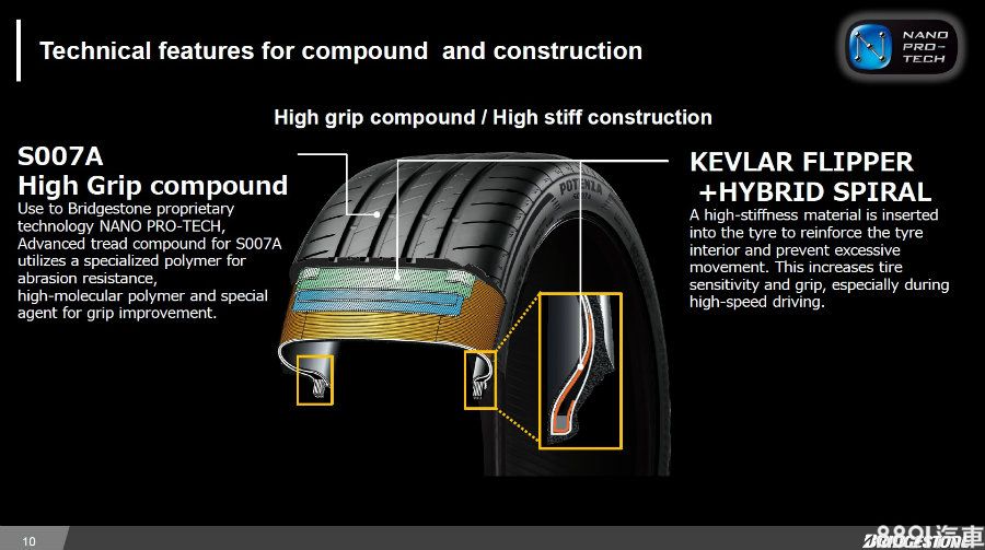 支撐性對於性能胎是項重點,S007A具備新的克維拉纖維與混合螺旋內緣結構,使胎面以及胎壁強度均優於過去的S001。