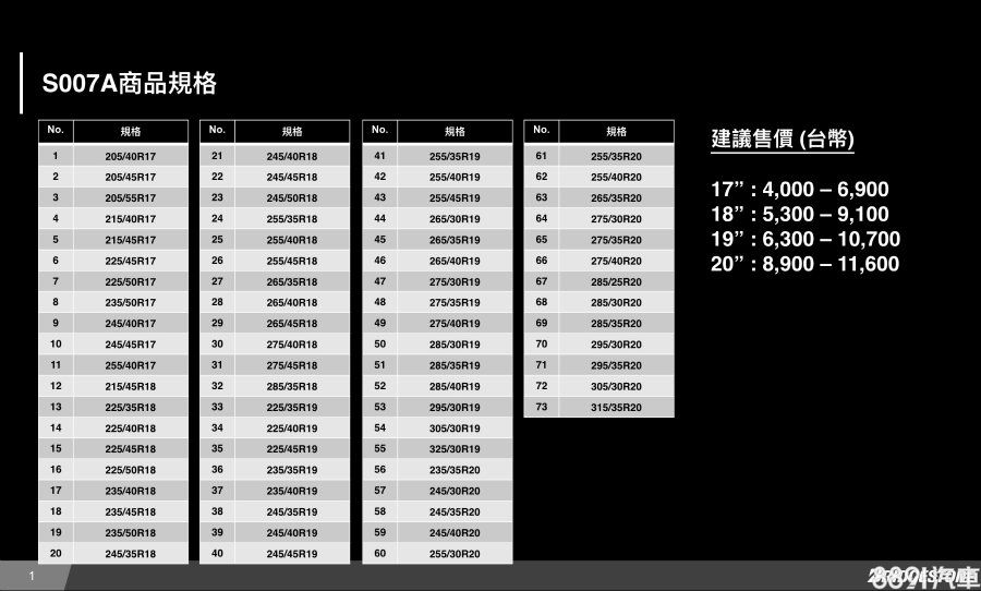 國內引進的Potenza S007A一律產自日本,提供的規格豐富,主要的17~19吋就有55種規格,此外,Potenza S007A不像Turanza T005採新、舊款(T001)並行的銷售策略,將直接取代先前的Potenza S001。