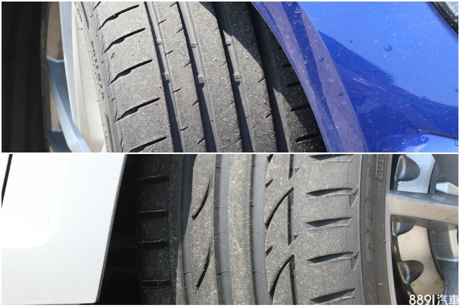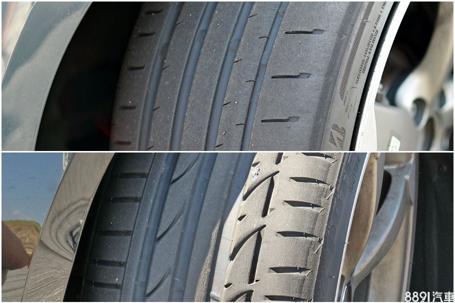此為S007A與S001多番激烈操駕後的胎面情況,上方的S007A表面磨損平均,下方的S001則出現些微的偏磨耗狀況,也就是俗稱的跳花。