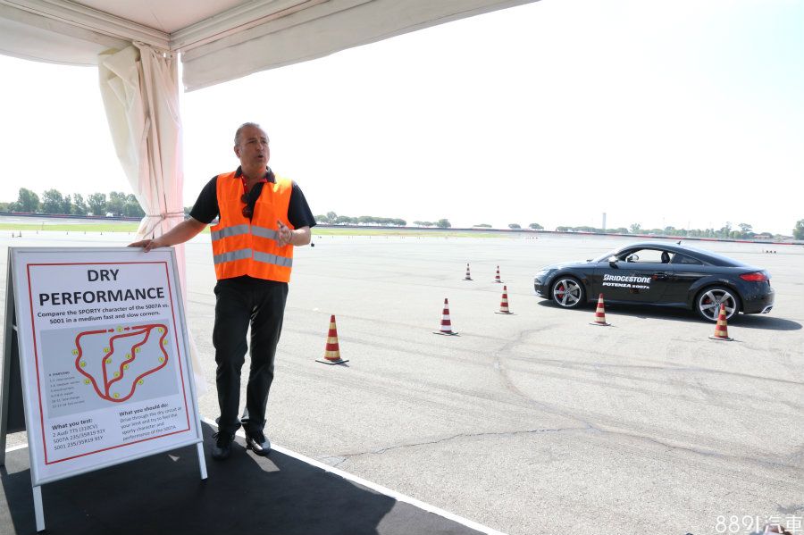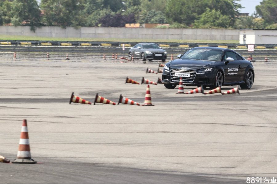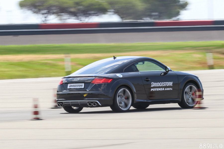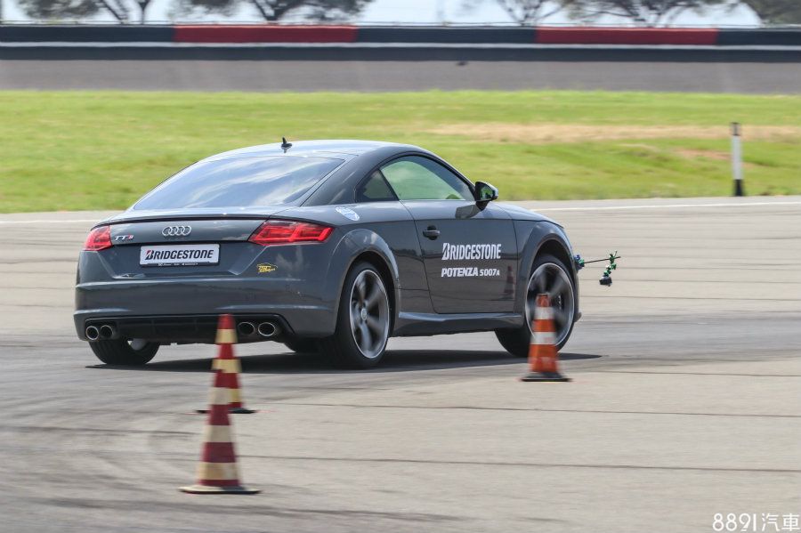 第二關的乾燥路面測試,以椎筒排列出各種連續彎路線,一樣有前後胎款比較,使用車輛則是Audi TTS。